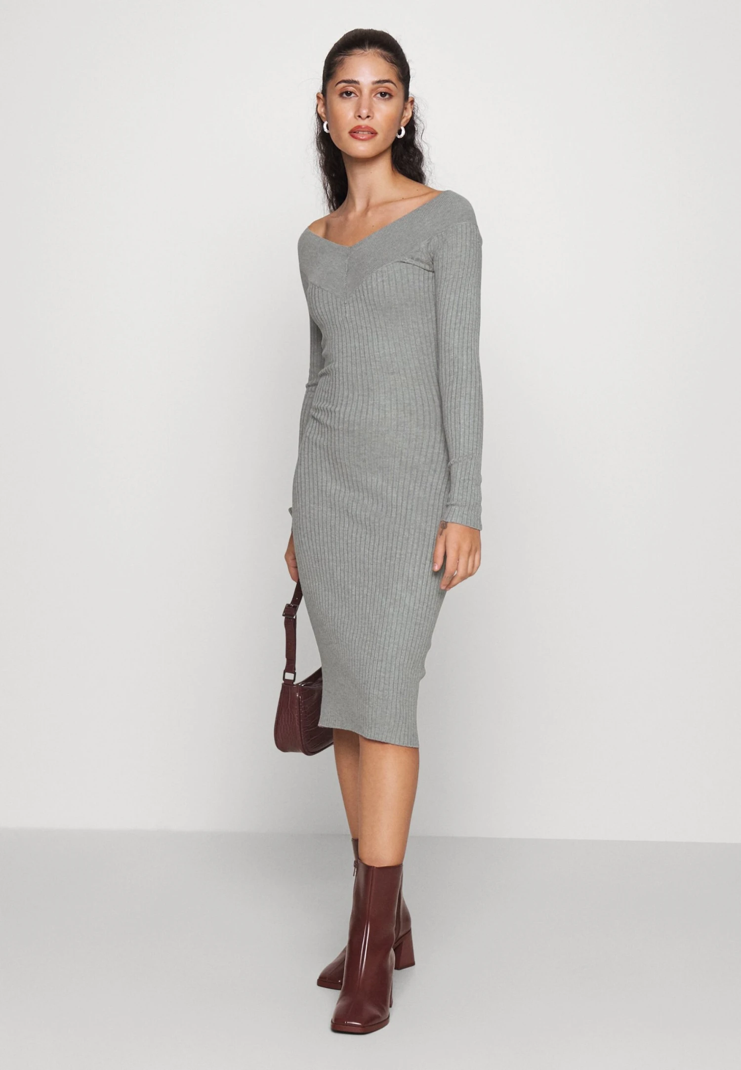 V Ausschnitt Ripp Mini Bodycon Strickkleid – Robe Fourreau – Mottled Grey